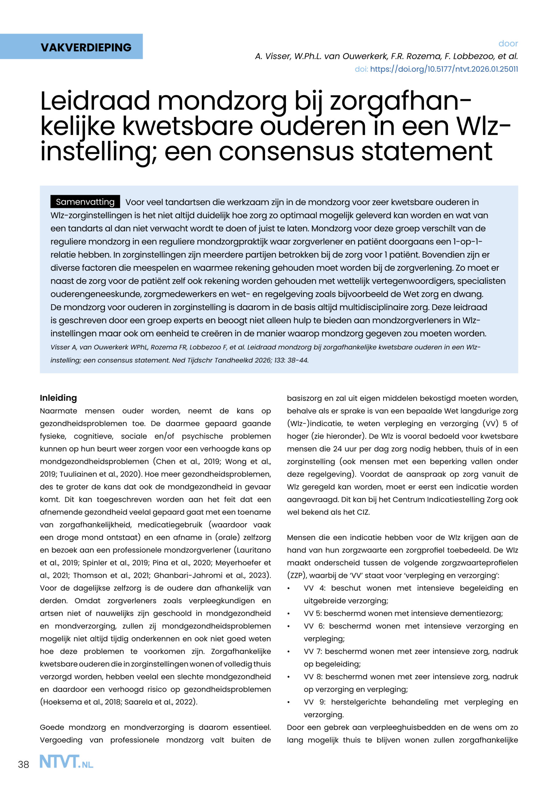 Voor veel tandartsen die werkzaam zijn in de mondzorg voor zeer kwetsbare ouderen in Wlz-zorginstellingen is het niet altijd duidelijk hoe zorg zo optimaal mogelijk geleverd kan worden en wat vaneen tandarts al dan niet verwacht wordt te doen of juist te laten. Mondzorg voor deze groep verschilt van de reguliere mondzorg in een reguliere mondzorgpraktijk waar zorgverlener en patiënt doorgaans een 1-op-1-relatie hebben. In zorginstellingen zijn meerdere partijen betrokken bij de zorg voor 1 patiënt. Bovendien zijn er diverse factoren die meespelen en waarmee rekening gehouden moet worden bij de zorgverlening. Zo moet er naast de zorg voor de patiënt zelf ook rekening worden gehouden met wettelijk vertegenwoordigers, specialisten ouderengeneeskunde, zorgmedewerkers en wet- en regelgeving zoals bijvoorbeeld de Wet zorg en dwang. De mondzorg voor ouderen in zorginstelling is daarom in de basis altijd multidisciplinaire zorg. Deze leidraad is geschreven door een groep experts en beoogt niet alleen hulp te bieden aan mondzorgverleners in Wlz-instellingen maar ook om eenheid te creëren in de manier waarop mondzorg gegeven zou moeten worden.